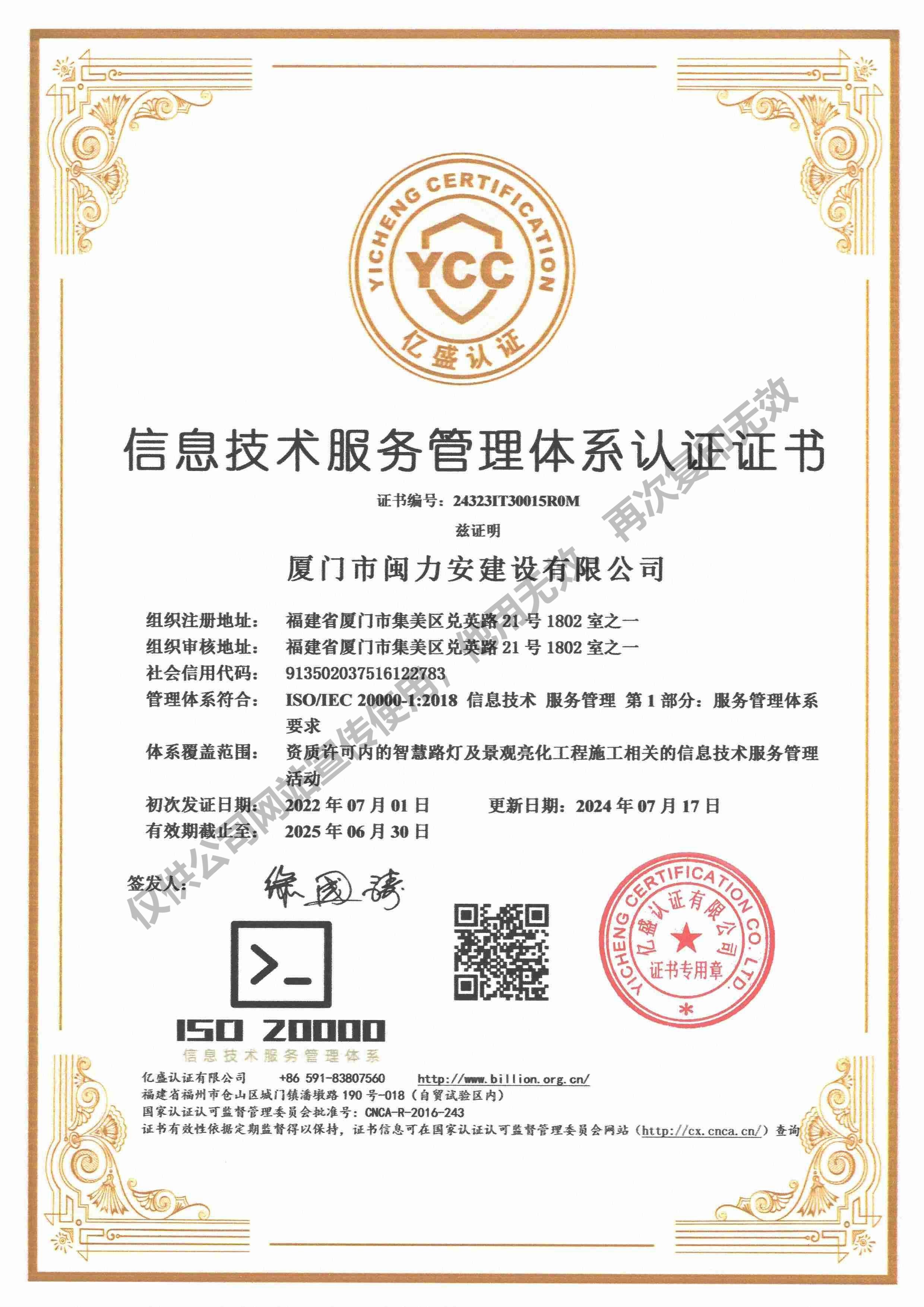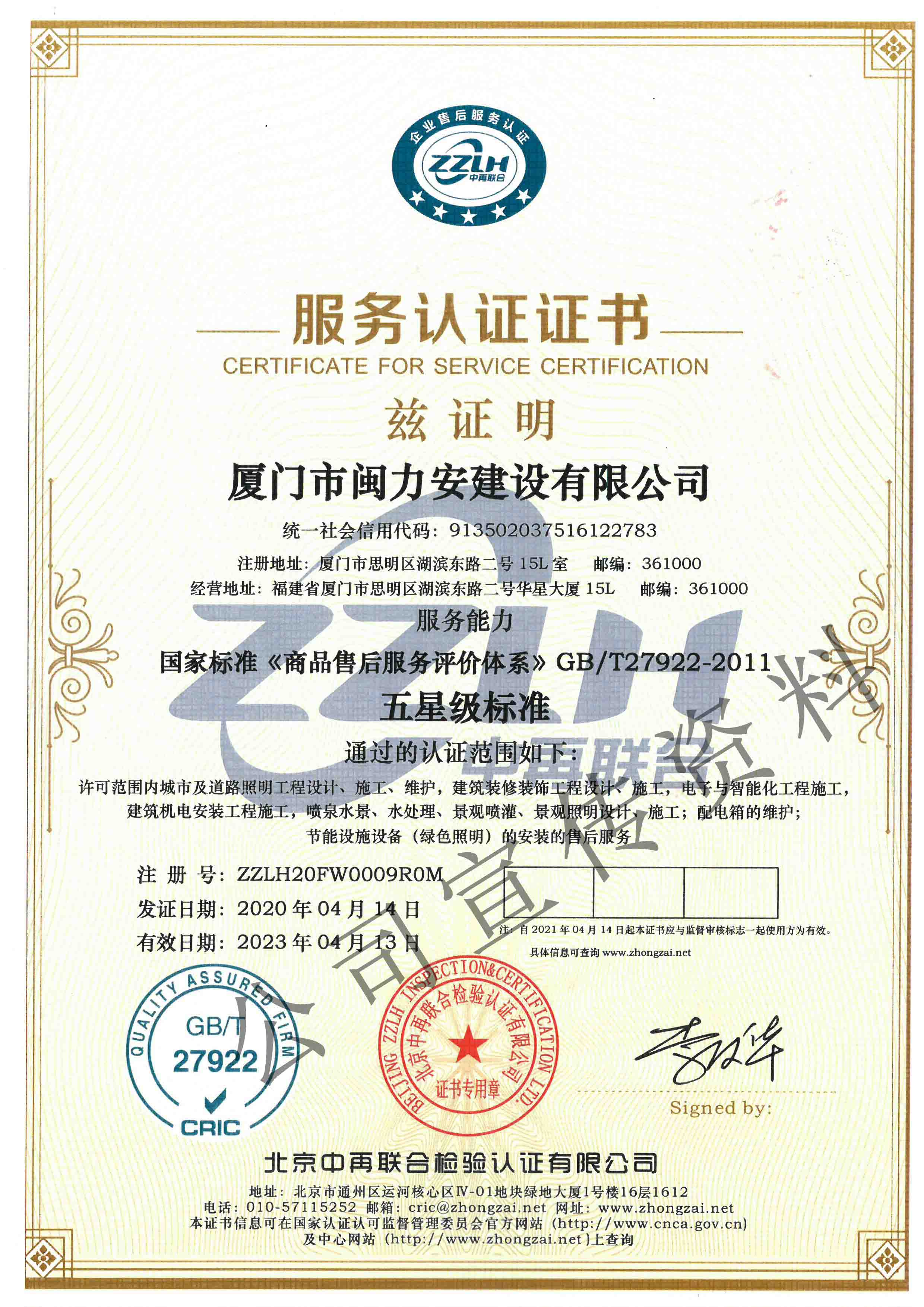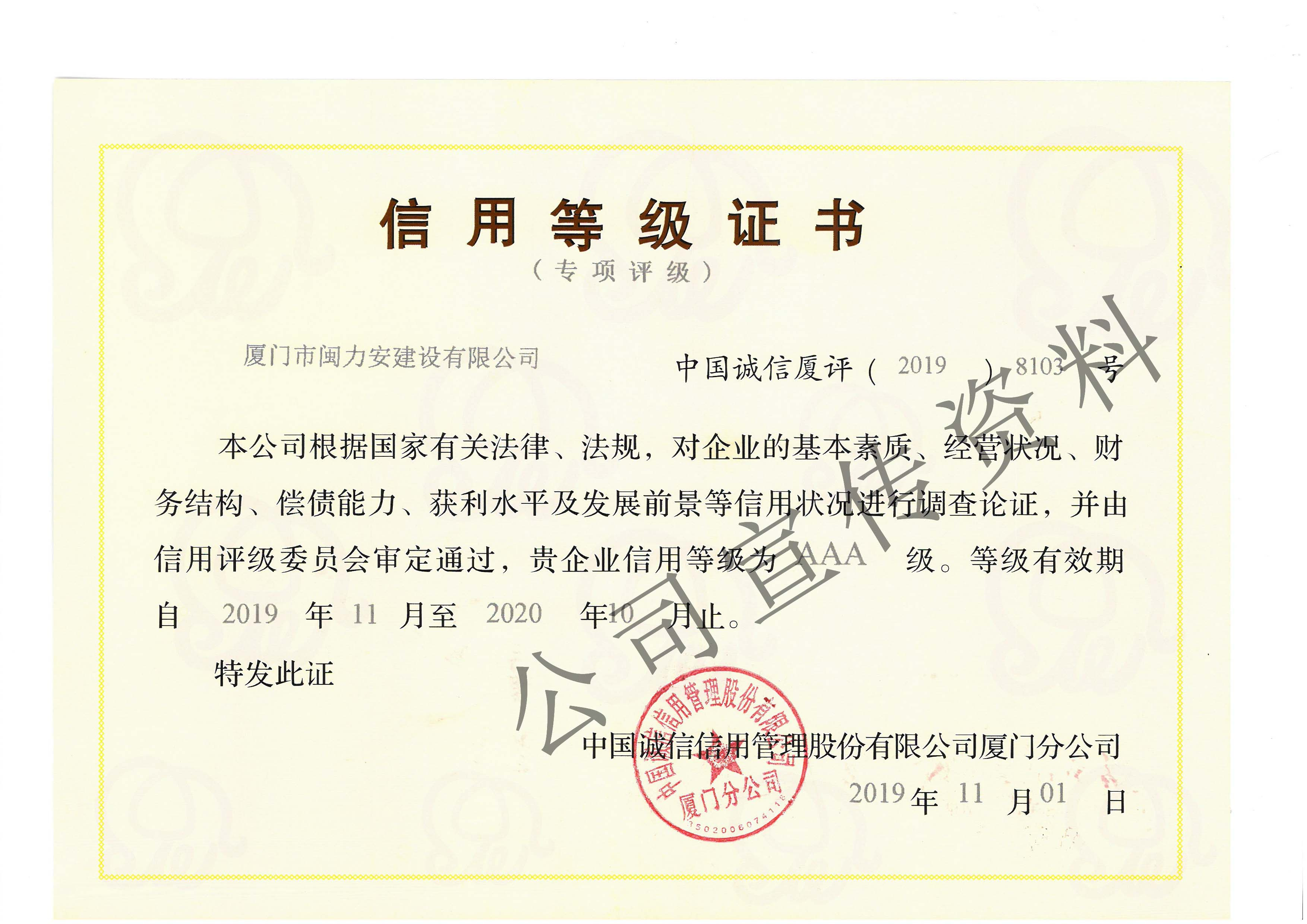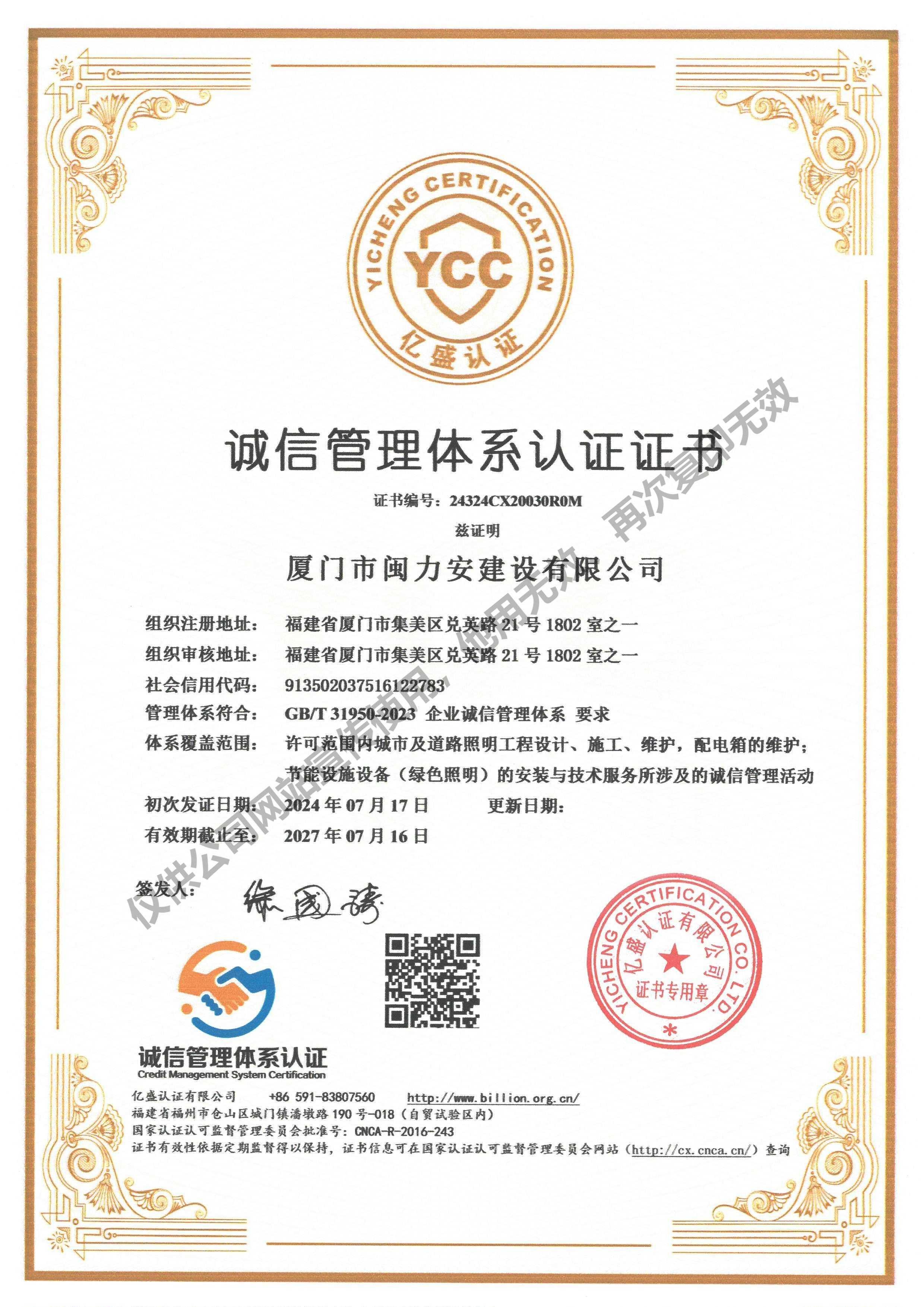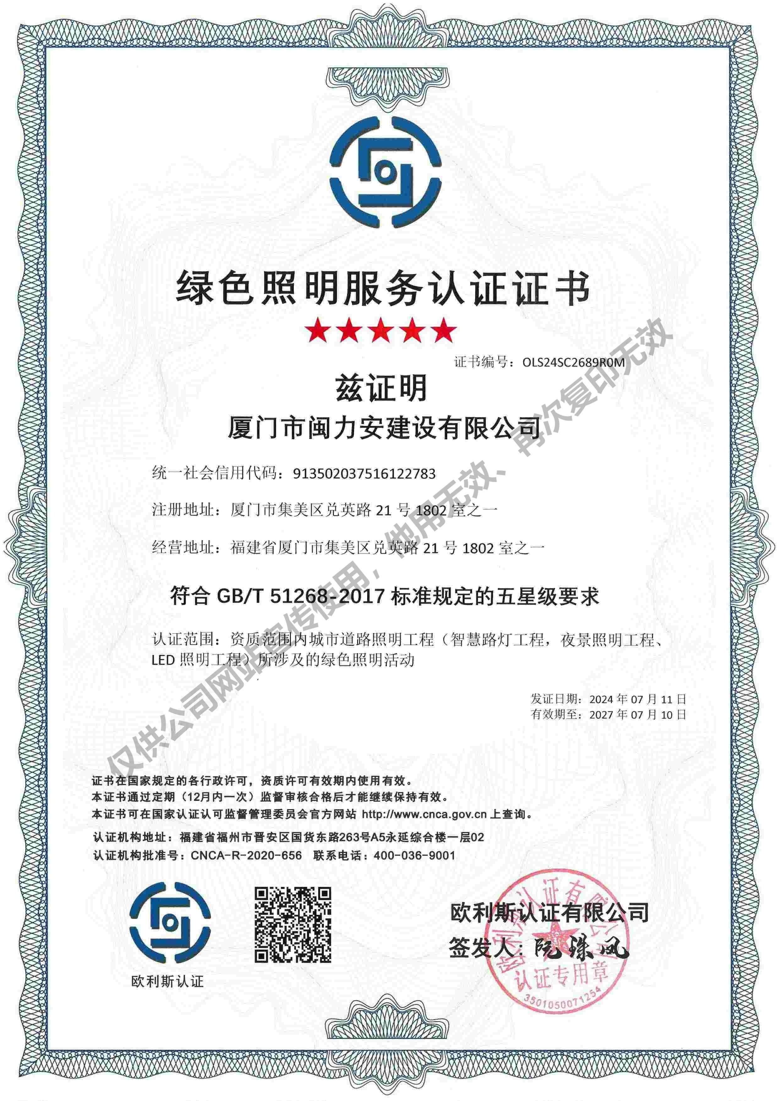 廈門市閩力安建設(shè)有限公司成立于2003年,公司取得市政公用工程施工總承包貳級、建筑裝修裝飾工程專業(yè)承包壹級、城市及道路照明工程專業(yè)承包壹級、電子與智能化工程專業(yè)承包貳級、消防設(shè)施工程專業(yè)承包貳級、電力工程施工總承包叁級、建筑機(jī)電安裝工程專業(yè)承包叁級、輸變電工程專業(yè)承包叁級、環(huán)保工程專業(yè)承包叁級、照明工程設(shè)計專項(xiàng)甲級、建筑裝飾工程設(shè)計乙級、施工勞務(wù)等資質(zhì)的綜合型企業(yè),公司于2013年通過了ISO9001質(zhì)量體系認(rèn)證,ISO14001環(huán)境管理體系認(rèn)證,OHSAS18001職業(yè)健康安全管理體系認(rèn)證。